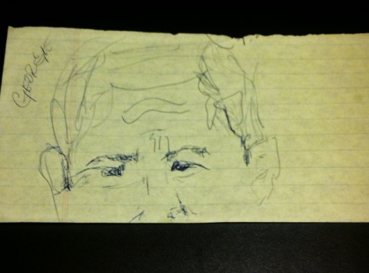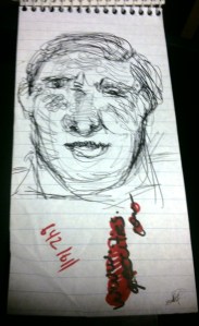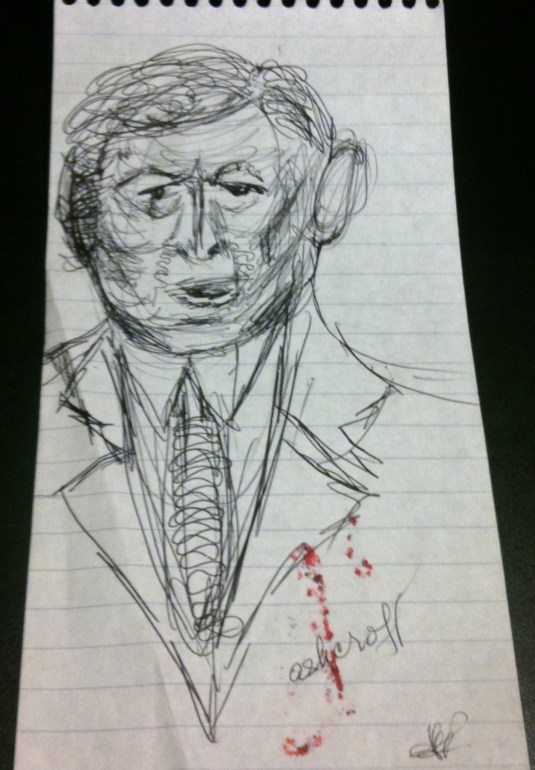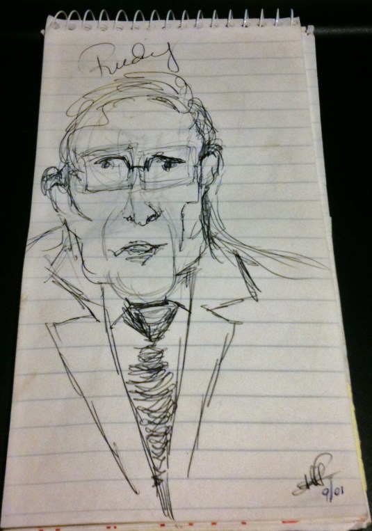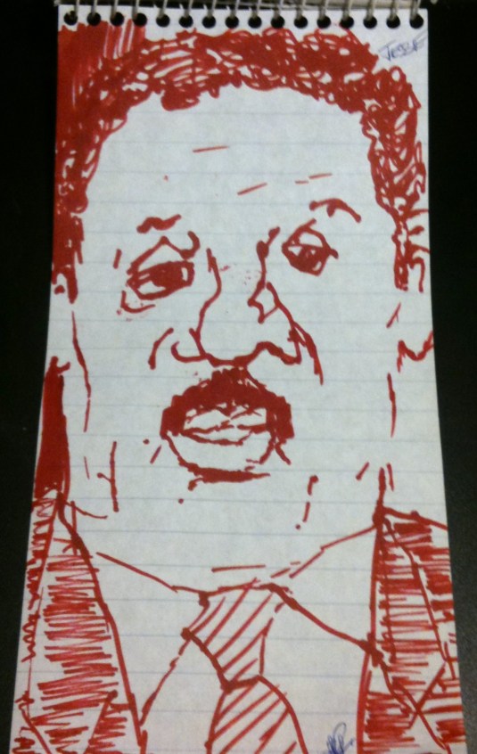 There were always reporter notebook pads laying around my work space and the rest of the station. So, as an outlet for relieving stress, I’d start to doodle little, amateur caricatures of public figures who’d catch my attention while on air. They weren’t the greatest drawings in the world, but were my connection to the events that affected us all.
