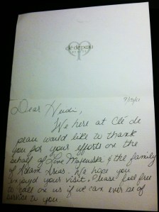 I have also saved a “Thank You” card sent to me from the cosmetics department of Clé de Peau of Sacks Fifth Avenue, located next to Rockefeller Plaza; I used to buy my make-up there and encountered a girl, “Love”, who worked in that department, and was trying to find her uncle… missing after the Towers went down. She had given me his picture to add to NBC’s search list that was being aired on TV and posted online, on a continuous basis. Unexpectedly, this card came to me in the mail from Love’s colleagues, writing on her behalf. I don’t know what the results were in locating her uncle, but I was forever touched to receive this for such little assistance:
